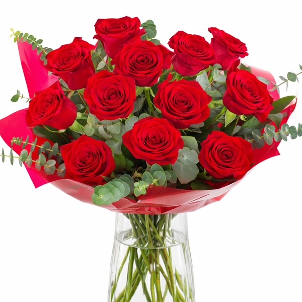 Klasyczny bukiet z 12 czerwonych róż, zapakowany w elegancki papier ozdobny i uzupełniony świeżą zielenią - w tym gałązkami eukaliptusa. Ponadczasowy, wyrazisty i pełen emocji – idealny wybór na rocznicę, wyznanie miłości i wszystkie wyjątkowe okazje. Piękny sposób na okazanie uczuć, który łączy klasyczną elegancję z przystępną ceną i dostawą od lokalnego florysty.