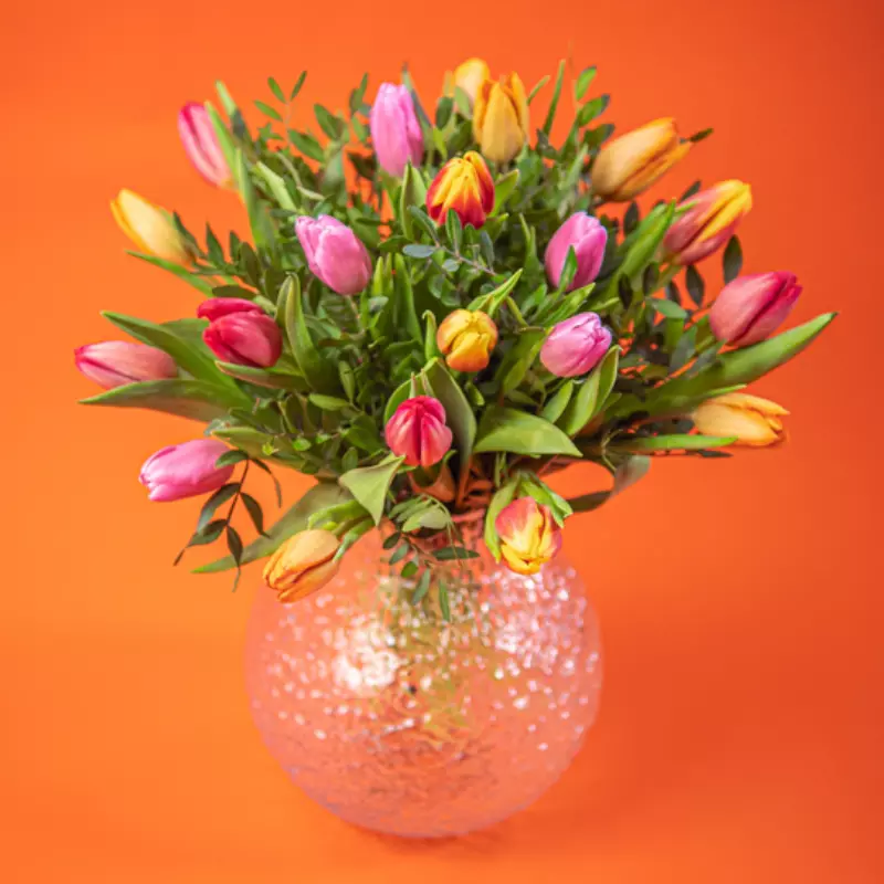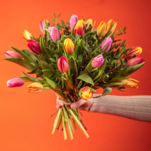 30 kolorowych tulipanów to 30 powodów do radości. Wyślij ten bukiet bliskiej osobie, a sprawisz jej tym gestem ogromną radość! Do bukietu, który będzie przygotowany i doręczony przez lokalną kwiaciarnię Euroflorist można dołączyć bilecik z życzeniami. Cena nie obejmuje wazonu.