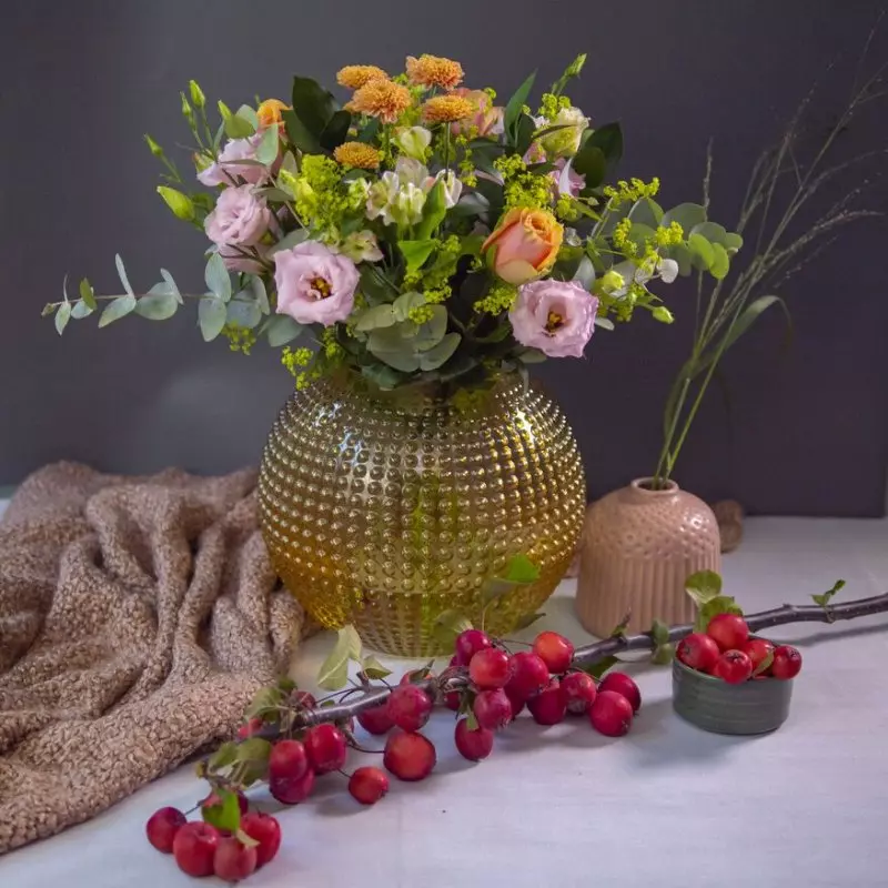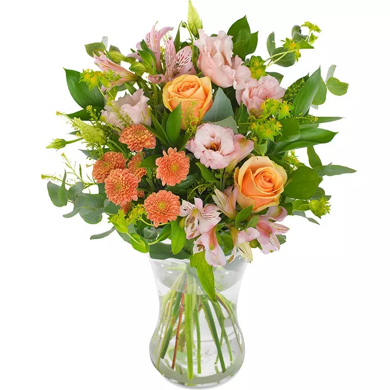 Ciepła kompozycja złożona z delikatnych odcieni różu i brzoskwini, zaprojektowana, by oczarować i zainspirować. Zawiera piękną mieszankę słodkich róż, chryzantem, eustom, alstremerii, innych sezonowych kwiatów oraz zielonych dodatków.
