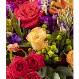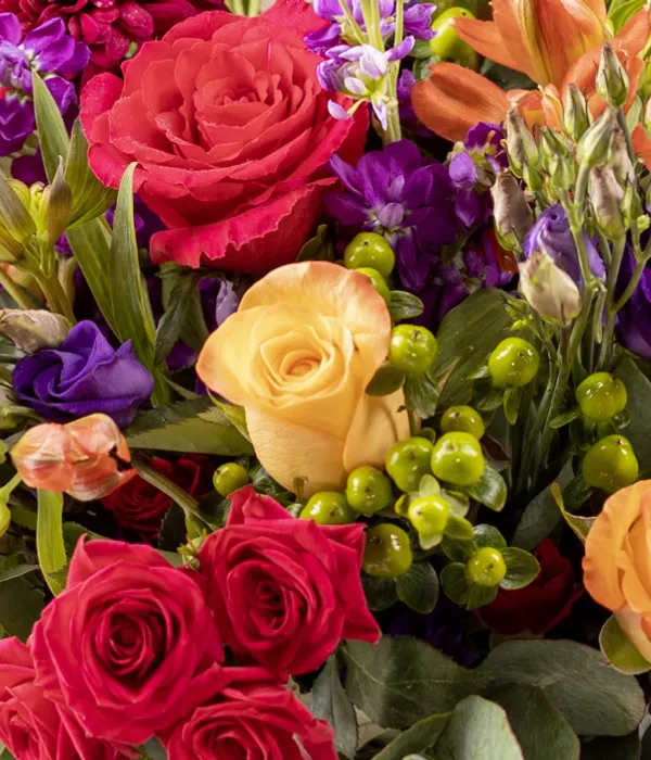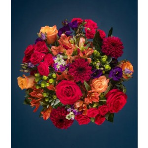 Obdarowując bliską osobą takim bukietem, dodatkowo przekazujesz mu wiadomość, że jest dla Ciebie kimś wyjątkowym.Ten piękny bukiet zawiera mieszankę pomarańczowych róż, czerwonych róż, fioletowych goździków, delikatnych pomarańczowych alstroemerii i fioletowych eustom uzupełnionych sezonowymi liśćmi.