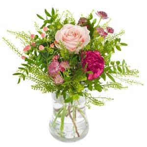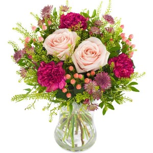 Piękny i uniwersalny bukiet w barwach różu i fioletu, który z pewnością oczaruje. Zawiera kwiaty takie jak goździki i róże.